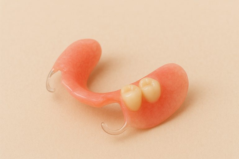 部分入れ歯とは、1~数本の歯を失った場合に使用する入れ歯です。歯茎を覆う床(しょう)と人工歯、そして入れ歯を引っかけるための留め具(クラスプ)で成り立っています。